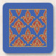 A set of six stylish coasters, with a traditional 'fleur de lys' pattern in burgundy, red and gold, with a wide deep blue border, from a digital design by Judy Adamson.