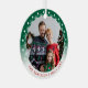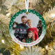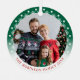 Stylish, colourful double sided, two photo, round ornaments. On the front side, this custom ornament design features your personal photo highlighted in a unique white and green gradient frame with delicate snowflakes. The designs modern typography displays your family name and the year or can be edited to read anything you like. The text is in a warm holiday red colour which also can be easily edited to any colour of your choosing. The back of the ornament fully displays your second photo. The perfect keepsake gift and tree décor for the holidays & Christmas.
