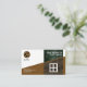 Card features an elegant dual toned side brick wall. The brown layer at the bottom is accentuated by a white framed window. Above this is a dark green luminous brick design which houses your prestigious name and job title. Westwards to this is a faux gold logo of a hammer which you can use. Below it is a slogan option. The contact details are south of this towards the baseline.