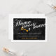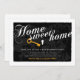 Stylish elegant modern Home Sweet Home Housewarming Invitation Template, ready for you to customize. Designed with calligraphy white text with a yellow key next to a key lock on a black background.