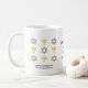 Stylish HAPPY HANUKKAH coffee mug, showing faux gold and silver STAR OF DAVID and MENORAH in a tiled pattern against a plain white background. Text reads HAPPY HANUKKAH with a placeholder name, and is CUSTOMIZABLE, so you can PERSONALIZE it by adding your name or other text. The design is repeated on the reverse, and in the middle there is CUSTOMIZABLE sample text, where you can personalize your message or greeting. Ideal for Hanukkah celebrations, and with customization can be suitable for any Jewish-themed event. Choose from a wide selection of can coolers by Berean Designs. Also available in midnight blue.