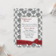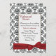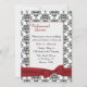 Elegant wedding rehearsal dinner invitation done in a black and white damask pattern, with a framed white text area, in the middle. Graphics of a pretty red ribbon and bow, decorates the bottom of the invitation. Text in black and dark red is ready to personalize for your event.