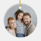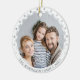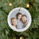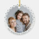 Stylish modern, double sided, two photo, round ceramic ornament. On the front side, this custom ornament design features your personal photo highlighted in a unique white gradient frame with delicate silver snowflakes. The designs modern typography displays your family name and the year or can be edited to read anything you like. The text is in a regal silver colour which also can be easily edited to any colour of your choosing. The back of the ornament fully displays your second photo. The perfect keepsake gift and tree décor for the holidays & Christmas.