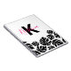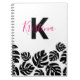 This is a chic and modern customizable notebook that beautifully combines personalization with style. The cover is adorned with a large, bold letter “K” in black, overlayed with the name “Kristina” in an elegant, cursive font rendered in a striking pink hue. This personal touch adds a unique charm to the notebook, making it a perfect gift for someone special or a stylish addition to your own stationery collection. The lower half of the cover is decorated with an array of black Monstera leaf silhouettes, offering a trendy and organic aesthetic. The Monstera leaves, known for their distinctive shape, add a touch of nature to the design, making it feel fresh and lively. The white background provides a clean and minimalist canvas that makes the other elements pop, creating a visually appealing contrast. This contrast enhances the readability of the text and the visibility of the design elements, making them stand out.