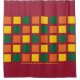 Stylish colourful Shower Curtain with geometric squares in yellow, green and orange, against a burgundy background. There is a placeholder Scripture which is CUSTOMIZABLE so you can replace with a personal message or inspirational quote. Modern addition to your bathroom decor. Matching items are available.