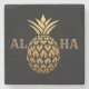 Stylish gold pineapple on black stone coaster with text, "Aloha."