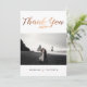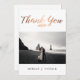 Stylish wedding thank you postcard template featuring a photo on the front with the text "Thank You" in a modern script font in faux shiny gold. There is a small foliage illustration under the text in faux gold as well. Custom thank you message on the back of the card. Elegant and modern design.