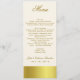 Elegant skinny wedding reception table menu, done in ivory, with graphics of gold tone band along the bottom, and covering the back. Custom text done in a golden brown is ready to personalize for your wedding reception. Lovely addition to our Stylish Gold Tone Wedding set.