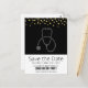 A save the date postcard with a split colour background of black and white. Faux gold confetti along the top border. Illustrated with a grey stethescope.