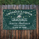 An stylish 'Congratulations to our Graduate' banner, featuring a green background that can be changed to any colour, string twinkle lights, silver glitter corners, a silver graduation cap and text that can easily be customized.