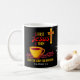 Stylish Jesus Coffee Lover coffee mug which reads FIRST JESUS THEN COFFEE THEN I'M READY FOR ANYTHING. The design includes a cross, a cup of coffee and coffee beans in red, yellow and brown. This Christian Jesus Coffee Lover coffee mug would make a great gift for coffee lovers who also love Jesus, especially at Christmas and for birthdays. Designed using Kittl. Matching gifts available.