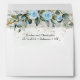 Stylish light pastel blue roses greenery and gold wedding envelope