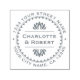 Rubber-stamping your mail is a popular way to add your return address. This stylish self-inking stamp features lotus flower motifs and a classic decorative border. Your names are centred inside the circle and your address is curved around the outside. Ink stamps are a great way to personalize your letters, parcels, invitations and wedding stationery.