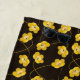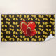 Trendy, chic and modern beach towel features personalized name and red / golden love hearts on black / yellow floral background.