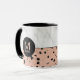 A stylish personalized mug featuring a trendy rose gold pattern with black spots over a white marble pattern. A round black frame encircles your monogram and name on both sides of this item. Edit the sample text with your desired text.
