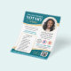 Marketing flyers are a great way to advertise your notary business and attract new clients. This stylish design showcases your photo inside a circular frame, with an elegant gold gradient. Personalize the template with your name, credentials, contact information, accreditation logos, services, and a convenient appointment-scheduling QR code. The text can be customized to suit your business. Perfect for a Notary Public, Loan Signing Agent, Mobile Notary, Certified Notary Trust Delivery Agent (CNTDA), Apostille or other legal profession. Printed colours: blue-green, teal, gold, black and white. Shop the online collection for more popular product ideas and supplies, designed for notaries!