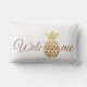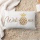 Stylish and modern gold pineapple on white decorator lumbar pillow with text, "'Welcome." Contact us for help with customization or to request matching products.
