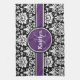 Elegant, feminine, floral damask background pattern in black and white with a customizable name label frame in purple for your monogram initial letter and personalized name.