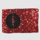 A golf towel decorated with a classic and elegant monogram in red on a stylish black circle together with faux red glitter.