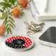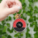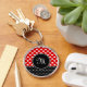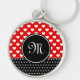 stylish red and black button keychain with your monogram and white hearts in polka dot pattern