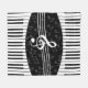 Stylish musical note clef and piano keys design in black white and grey with dark grey musical notes on black in the background. great gift for any music lover or budding musician