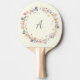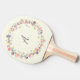This stylish ping pong paddle feature a pretty floral wreath with delicate flowers in earthy pastel shades of pink, yellow, and blue, personalized with your initial.