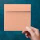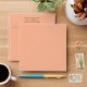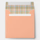 Pretty peach coloured square invitation envelope with a neutral pastel plaid pattern lining the inside. Dark grey custom return address is ready to personalize, on the back flap. Lovely finishing touch to our Plaid Couple's baby shower invitation.