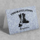 A simple military passing out greeting card featuring, the word "congratulations", a pair of military boots in silhouette and the name of the soldier. The text font styles, size and colour can be changed by clicking on the customize further link after personalizing.