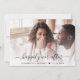 Modern light cream save the date announcement featuring your photo overlayed with "happily ever after" in a stylish script with swashes and your names and wedding date joined together with a heart. On the back, personalize your announcement in elegant typography and and input your wedding website address to create a QR code for your guests to scan for wedding updates and details.
