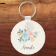 A keychain with a pretty watercolor illustration. A flower bouquet with pink and blue flowers surrounded by green leaves and sprigs.