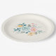Paper plates with a pretty watercolor illustration. A flower bouquet with pink and blue flowers surrounded by green leaves and sprigs.