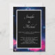 Wedding invitation with a beautiful abstract design in pink and blue. White stars sprinkled throughout this image of the cosmos. A black rectangle layered over top with your text inside.