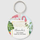 A baby shower thank you key chain with a cute and whimsical pink flamingo. Surrounded by green tropical leaves, and red and yellow hibiscus flowers. A rectangle shaped, gold gradient frame in the centre.