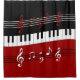 A cool and eye-catching piano music design featuring piano keys in a waving motion in the centre with red, black and white musical notes scores above and below in alternating colours.
