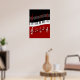 A cool and eye-catching piano music design featuring piano keys in a waving motion in the centre with red, black and white musical notes scores above and below in alternating colours.