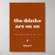 The drinks are on us, the hangover is on you: Open Bar wedding sign. A retro chic theme: adopt this vintage and stylish typographic design for your Wedding stationery, with a burnt orange colour theme. Easy to mix and match with our similar stationery available in peach pink, terracotta & brown sugar. Fully customizable text colours and backgrounds.