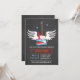 This stylish, trendy and cool baby shower invitation has a flaming red electric guitar with a pair of white wings behind it. The banner wrapped around the guitar reads "Rock a Bye Baby Shower" which is an amusing pun twist to a classic baby lullaby. Dark grey background has a light texture design to it. On the reverse is a classic vinyl record with musical notes and stars for decorations. This invitation is perfect for any rock and roll, music or rock star theme baby shower celebration! Personalize easily with your baby shower details.