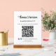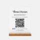 White acrylic tabletop sign featuring your name showcased in a stylish signature script and business type in simple modern lettering. Input your website address to create a scannable QR code for customers and clients to see your products, services, hours, etc. Add your instagram and facebook user ids for customers to follow you on social media.