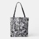 This stylish tote bag features a vibrant decorative pattern with various geometric shapes and designs, including triangles, circles, and lines, in black and white. The black handles provide a comfortable and sturdy grip. Ideal for everyday use, shopping, or as a thoughtful gift for friends and family. The intricate and dynamic pattern adds a touch of uniqueness and elegance to your accessory collection.