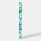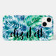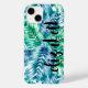 A stylish cell phone case features a pattern of tropical palm fronds in turquoise blue and green and your name in chic lettering. Create for yourself or give as a gift. Choose your PHONE MODEL and STYLE CASE when ordering. MATCHING items in our travel collection.