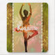 A watercolor painted ballerina posing on a pastel flowery backdrop where you can personalize it on the tutu joined by a necklace border where on the sides are lotus petals on a deep green and orange backround for extra style. Girly dancer vibes.