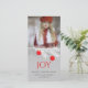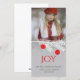 Lovely Christmas photo card done in a vertical look, with the picture area, on the top half of the card. The bottom half of the card is decorated with graphics of a white pine branch with red ornaments against a grey background with silver tone glitter look accent. Joy in large red text and custom dark grey text below that, is ready to personalize. Model photo courtesy of Lori Lang.