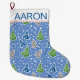 Stylized Christmas trees pattern blue and name Large Christmas Stocking. It features Christmas trees in green, grey and blue on blue background with white snowflakes.