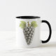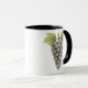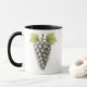 This mug presents a bunch of silver grapes with a smooth and shiny rendering, accompanied by finely detailed green leaves. The stylized illustration is distinguished by its graphic simplicity and its original appearance. This unique visual attracts attention thanks to its elegant contrast and metallic finish that gives the mug character. A perfect choice for a refined and modern design around the theme of grapes.