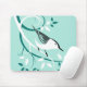 Stylized bird art on mousepads featuring a Nuthatch on swirl pattern branches and decorative leaves on light blue background.