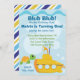 Enjoy some maritime fum with this adorable nautical invitation featuring a submarine, a turtle and some bubbles, the revers is a fun preppy stripe!