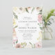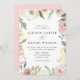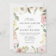 Elegant floral wedding invitations featuring your wedding details framed by a border of watercolor roses and leaves in muted shades of pink, ivory, mauve, and green. The reverse side displays a solid light pink background. Designed to coordinate with our Subtle Blooms wedding collection.
