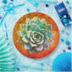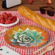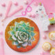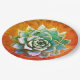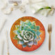 An aqua succulent with a hint of lavender is framed by a fiery background of rusty orange. These eye-catching plates will be sure to brighten up any celebration.