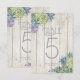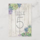 Des polices uniques, des succulentes aquarelles colorées et des fonds en planches de bois rustiques sont les points forts de ces produits de mariage à assortir. Cette belle carte de numéro de table comporte des bordures de coins de feuillage sur un fond en bois clair avec un modèle fourni pour modifier les numéros, les noms des mariés et la date du mariage. Recherchez ID515 pour voir tous les produits correspondants dans cet ensemble.
