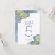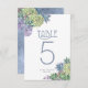 Unique fonts, colourful watercolor succulents and glittery backgrounds in a soft dusty blue are the highlights of these mix-and-match wedding products. This beautiful table number card has foliage corner borders on a white background with a provided template to edit numbers, bride and groom's names and wedding date. A shiny, textured pattern, in light and dark tones of dusty blue, adds a contrasting background on the reverse. Search ID515 to see all the matching products in this set.